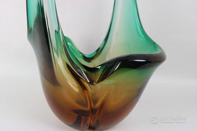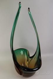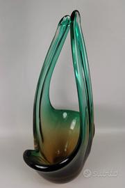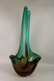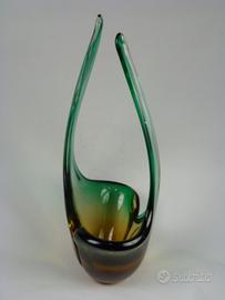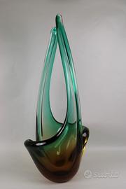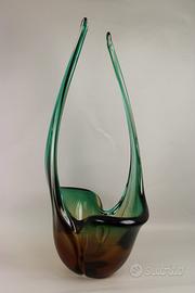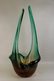 Grande e pesante vaso ornamentale, costolato e terminante con 2 lunghe punte, in vetro di Murano nelle tonalità del verde e del bruno.