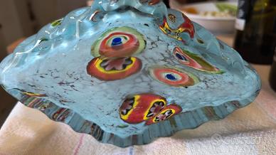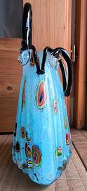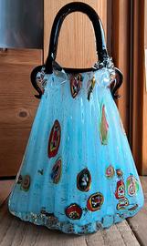 particolare vaso di Murano a forma di borsetta nei colori del celeste, murrine e manici neri. altezza cm 24,5 misura alla base (parte larga) cm 17. la spedizione non è inclusa