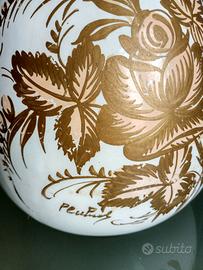 Vaso Vintage N° 395 in ceramica dipinto a mano e firmato (davanti in basso) Di colore bianco, dipinto con i colori beige e bronzo Altezza 26,5 cm,diametro 20 cm. Difetto: piccola scheggia appena visibile sotto il bordo superiore (si vede nella foto 1 e foto 4) Acquistata nei primi 80