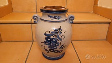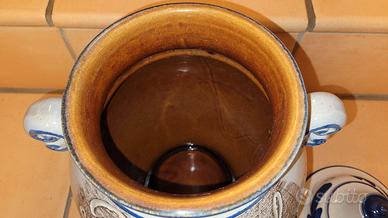 Vendo originale contenitore per la preparazione di Rumtopf in perfette condizioni. Grande vaso con incisione e decorazioni, per conservare la frutta al rum, con due manici laterali. Il recipiente ha la forma di giara. Vendo per inutilizzo