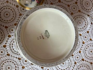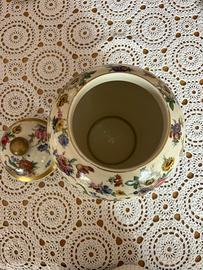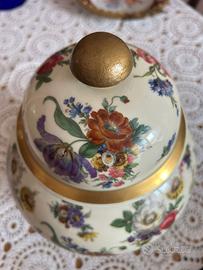 Vaso coperto in porcellana bavarese Tirschenreuth – primi ’900 Elegante vaso coperto (potiche) in porcellana bavarese Tirschenreuth, manifattura tedesca di alta qualità, risalente alla prima metà del Novecento. Il vaso presenta una ricca decorazione floreale policroma finemente eseguita, con motivi naturalistici continui su fondo avorio. Le dorature originali sono presenti e ben conservate, in particolare sulla fascia centrale, sul bordo del coperchio e sul pomolo. Coperchio originale incluso, elemento fondamentale e spesso mancante in questo tipo di oggetti. Condizioni: ottime, senza crepe, sbeccature o restauri visibili. Dimensioni: altezza totale circa 35 cm. Marchio originale sul fondo “Porzellanfabrik Tirschenreuth – Bavaria” con numerazione di manifattura. Oggetto decorativo di grande eleganza, ideale per ambienti classici, collezionisti di porcellane europee o come pezzo d’arredo di pregio.