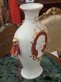 Incantevole vaso in porcellana bianca con medaglione centrale a cammeo, su sfondo rosso, incorniciato da decorazione in oro zecchino a rilievo. Ai lati due anse decorative a forma di nappa in ceramica rosso e oro.