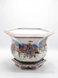 Vaso portafiori in porcellana Cina, XX secolo cm. 28x40x36 più base d’appoggio Elegante vaso in porcellana bianca di forma esagonale con base abbinata, decorato a mano con policromia vivace secondo la tradizione della famiglia rosa (fencai). Il corpo, di forma panciuta con orlo svasato, è interamente dipinto con una raffinata scena di corte animata da figure maschili e fanciulli in abiti tradizionali, immersi in un paesaggio montano con rocce azzurre e vegetazione. I personaggi recano oggetti simbolici — lanterne, fiori di loto, pesci — riferimenti iconografici agli Otto Immortali e ai temi propiziatori tipici dell’arte decorativa cinese. Il bordo superiore è ornato da una fascia a motivi floreali e volute in rosso, giallo e verde, mentre la fascia inferiore presenta decori geometrici a fondo blu con riquadri gialli e rosa/rossi. La base ottagonale riprende i medesimi elementi decorativi con fregi a chiave greca in giallo e fiori stilizzati. In buono stato di conservazione, con lievi segni d’uso coerenti con l’epoca.