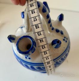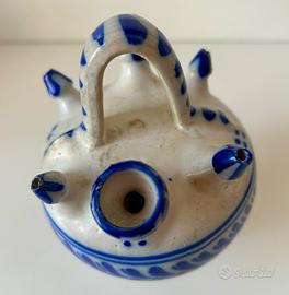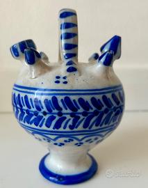 Ceramica artigianale in stile Toledo, firmata “GM” sul fondo, decorata in blu e bianco. Si tratta di un vaso portafiori multiplo: presenta un foro centrale più grande e 5 fori laterali, pensati per inserire più steli e creare piccole composizioni floreali. Oggetto originale e poco comune, ideale per: •piccoli fiori freschi o secchi •arredamento rustico / mediterraneo •collezionisti di ceramica artigianale