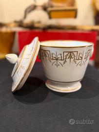 Elegante vaso potiche della manifattura Capodimonte, antica porcellana bianca e oro con coperchio e finiture geometriche dorate. Altezza 16 cm.