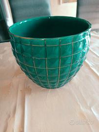Vaso vintage in ceramica smaltata verde con decorazione “a superficie a punta di diamante” in rilievo, attribuito a Guido Andloviz per SCI Laveno, autentica eccellenza del design italiano mid-century. Sul fondo, si intravede il timbro originale “Verbanum Stone SCI Laveno”, leggermente sbiadito dal tempo; si allega anche foto di un vaso simile con timbro ben visibile per facilitarne il raffronto.