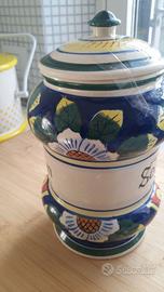 Ottimo stato. Con marchio sul fondo, dipinto a mano. Coperchio presente, scritta Saccarum, modello "antica farmacia".