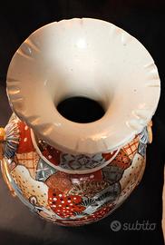 Imponente vaso in porcellana Satsuma di grandi dimensioni, realizzato per l’esportazione e finemente dipinto interamente a mano. Superficie con il tipico fondo avorio e decorazione estremamente ricca, con scene figurative orientali raffiguranti personaggi giapponesi in abiti tradizionali, alternate a pannelli floreali e geometrici.