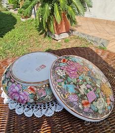 Vaso, Scatola, Ciotola con Coperchio. Antica Porcellana Cinese Realizzata completamente a Mano, Fondo in Oro e decorazioni Floreali in Smalti Policromi. Peso 1,6Kg. Diametro cm 27. Circonferenza cm 81. Altezza cm 10. Presente Marchio sul fondo. Completa di Coperchio Autentico. Condizioni Perfette, Nessuna crepa ne scheggiatura. Spedizione Sicura con Tutte le precauzioni antirottura.