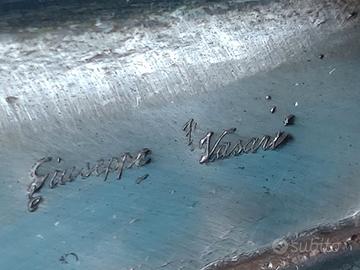La bellezza sta nella rarità, oppure in qualcos'altro. In questo caso è questo qualcos'altro che cattura nel suo ammaliante senso del semplice eppure quotidiano necessario tutto umano, come il dialogo, titolo del vaso. I due volti si parlano, si confrontano, uno riflette sulle parole dell'altro. E l'altro riflette le precedenti parole dell'altro. Mutevole lento divenire. Realizzato in alluminio con toni oro e argento, base in resina trasparente e vellutino. Firma incussa su di un lato. Condizioni impeccabili. Misure di riferimento in foto. Le foto descrivono esattamente il vaso e sono parte integrante della descrizione. Visita il mio profilo per altri vasi in alluminio e non solo.