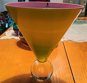 Forma conica, base d'appoggio sferica. Colore verde e lilla, sfera trasparente.