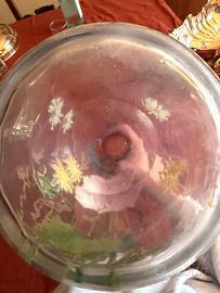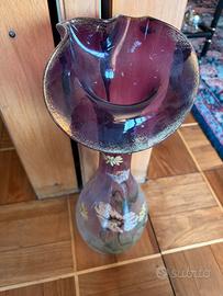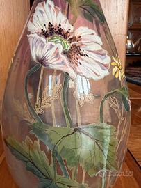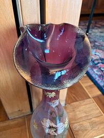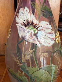 Questo raffinato oggetto è un vaso in vetro smaltato in stile Art Nouveau, risalente alla fine del XIX o all'inizio del XX secolo Dettagli del Design Attribuzione: Questo tipo di lavorazione è caratteristico dei laboratori di François-Théodore Legras a Saint-Denis, spesso commercializzati sotto il marchio Mont Joye. Materiali e Tecnica: Il vaso presenta un vetro color ametista (viola intenso) sul collo che sfuma verso il trasparente alla base. È decorato con motivi floreali smaltati e dipinti a mano, come papaveri e margherite, arricchiti da rifiniture in oro. Forma: La sommità ondulata e svasata è un elemento distintivo di questo stile, talvolta descritta come "orchid-shaped collar" o "jack-in-the-pulpit"