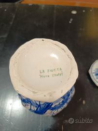 Piccolo vaso con coperchio in porcellana o ceramica bianca e blu, caratterizzato da una decorazione pittorica che raffigura un uccello simile a un airone circondato da motivi floreali. Il design è ispirato alla classica porcellana blu e bianca, spesso associata a stili orientali. Il vaso presenta un corpo bombato che si restringe verso il collo, poggiante su una base svasata, sormontato da un coperchio con pomello decorato. Prodotto dalla manifattura La Fiorita (Nove), azienda nota per le sue produzioni artigianali di ceramiche artistiche e decorative. Nove è un centro storico di grande tradizione ceramica nel vicentino. Oggetti con questo marchio sono considerati pezzi da collezione H cm 16