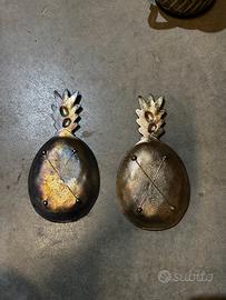 Questi oggetti sono vassoi o piatti decorativi a forma di ananas, spesso utilizzati come svuotatasche o elementi decorativi per la casa. Realizzati in materiali metallici con finiture color argento e oro. Presentano un design dettagliato che imita la buccia e il ciuffo dell'ananas. Ideali per contenere piccoli oggetti come chiavi, gioielli o monete. Spesso venduti come oggetti d'arte vintage o elementi di design tropicale