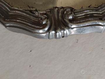Vendo vassoio a specchio anni 40, misura 27 cm di diametro, con bordo argentato. Si segnala lieve sfogliatura sul bordo dello specchio come si rileva dalla foto.