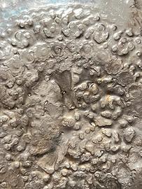 Splendido piatto decorativo vintage realizzato in metallo argentato con una lavorazione artigianale molto dettagliata. Il vassoio presenta una ricca decorazione centrale a motivi floreali e geometrici, tipica dell'artigianato orientale/persiano, ottenuta con la tecnica dello sbalzo e dell'incisione.