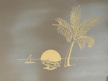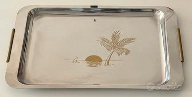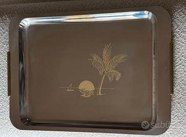 Vassoio in acciaio inox 18/10 con decori in tono oro e sui manici - dim 28x40 cm.; popolari a metà del XX secolo, spesso incorporando elementi decorativi come la placcatura in oro per migliorare il loro fascino estetico. Il decoro a tematropicale con palma, sole e barca a velaè un'icona del design italiano tra la fine deglianni '70 e i primi anni '80. Basandoci su produzioni simili,i riferimenti più probabili potrebbero essere: Vemi (Linea "Bombay"): questa azienda italiana è stata una delle principali produttrici di vassoi in acciaio 18/10 con serigrafie dorate. I loro decori avevano spesso questo tratto minimalista e stilizzato – Gottinghen: un altro marchio storico che utilizzava inserti e serigrafie inoro 24kt su acciaio inox. La tipologia di manico cilindrico dorato che vediamo nel tuo vassoio è molto coerente con i loro modelli più essenziali - Produzioni di distretto (Lumezzane/Omegna): gran parte di questi vassoi proveniva dai distretti metallurgici bresciani o piemontesi, dove molte aziende producevano modelli simili per la grande distribuzione o come articoli da regalo.Essendo in acciaio 18/10, il materiale è di alta qualità, ma presenta graffi e leggera ossidazione delle parti dorate (maniglie). Non presenta marchi punzonati poiché spesso venivano prodotti da aziende di casalinghi che apponevano solo un'etichetta adesiva (ormai persa).Prezzo Trattabile.