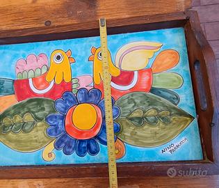 Vassoio in legno con piastra in ceramica interamente lavorato a mano. Disegnato e decorato a mano. Arte siciliana firmata Nino Parrucca