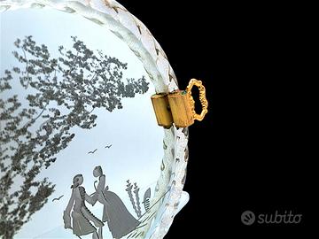 La Scena Centrale: Il piano in vetro (con base specchiata o argentata) raffigura una classica "Scena Galante" veneziana del XVIII secolo: una Dama e un Cavaliere in abiti d'epoca colti in un momento di corteggiamento sotto un albero. La decorazione è realizzata con una tecnica di incisione satinata (frosting) su sfondo specchiato/lucido.
