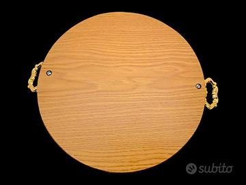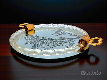 Completano l'opera due eleganti manici in metallo dorato lavorato e una base in legno solida (visibile sul retro) che garantisce stabilità e protezione. Perfetto come vassoio da portata per liquori e bicchieri di cristallo, o come elegante svuotatasche su una consolle.