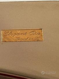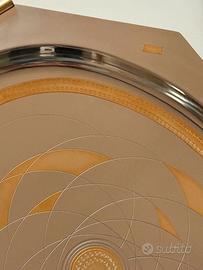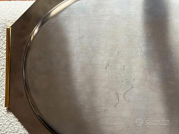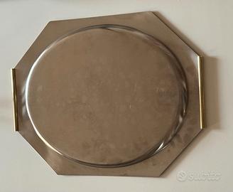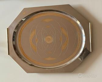 Vassoio Ottagonale Decori con placcature oro 24K Elegant Oro - dim cm 44x33cm: si tratta di un pezzo tipico della produzione Elegant Oro Gioiel 24K degli anni '80 e '90, caratterizzato dall'uso di materiali di alta qualità e finiture preziose. Realizzato in acciaio inox 18/10 (AISI 304), noto per la sua elevata resistenza alla corrosione e brillantezza. Gli inserti e i disegni sulla superficie sono realizzati in Oro 24 carati (oro zecchino), applicati con lavorazione artigianale. Spesso questi decori erano firmati da designer come Roberta C. Il vassoio presenta una forma ottagonale moderna con un decoro centrale geometrico a cerchi concentrici e manici dorati lineari. Dimensioni 44x33 cm in ottime condizioni tutta la parte decorativa e la decorazione in oro;il retro presenta ossidazione acciaio pulibile e piccoli graffi. Prezzo trattabile. NOTA: bicchieri e bottiglia solo ad uso fotografico e non inclusi.