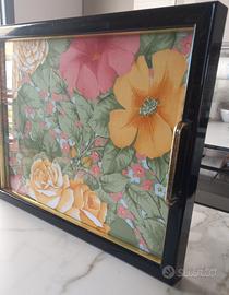Vassoio rettangolare da portata, vintage, con motivi floreali stampati su seta, ricoperto da fibra di vetro.