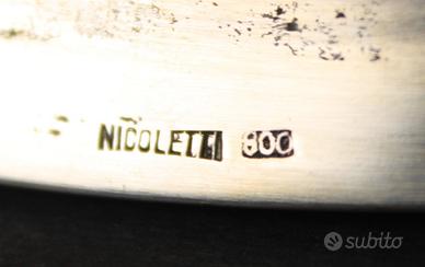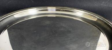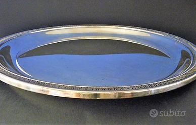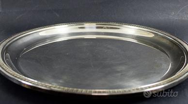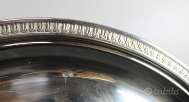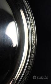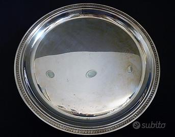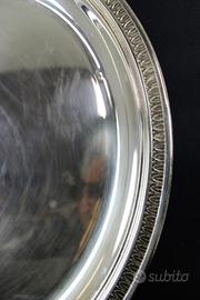 Vassoio in argento 800 a forma tonda con superficie liscia e cornice cesellata a teoria di palmette, nel classico stile impero.