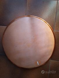 sopra il vassoio di rame è lucidissimo a specchio. presenta graffi leggeri e un graffio al centro [grande come una moneta], che non ne compromette l'uso. può essere coperto con un piccolo adesivo oppure verniciato .