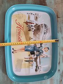 L'oggetto nell'immagine è un vassoio pubblicitario vintage del marchio "Horvath Dolci Tradizioni". Stile retrò, con l'immagine di una hostess e un aereo, che richiama le pubblicità degli anni passati.