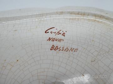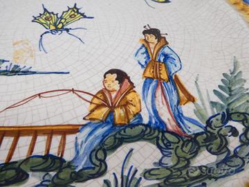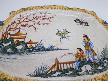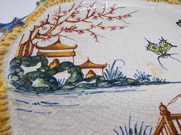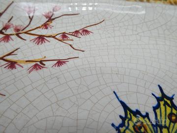 Splendido vassoio vintage in ceramica smaltata della manifattura Carpiè di Nove di Bassano, con decoro ispirato all’estremo oriente: una scena pittorica con figure orientali, farfalle e paesaggio naturale. Realizzato interamente a mano, presenta colori vivaci e una finitura craquelé tipica della lavorazione artigianale degli anni ’50-’60.