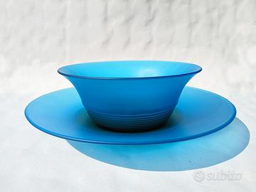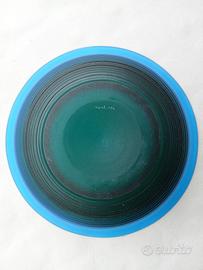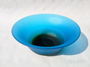 Set (vendibile anche singolarmente) di vaso e piatto in vetro blu con meravigliose sfumature verdi, realizzati in vetro di Murano dalla nota storica vetreria VeArt Venezia, che in seguito verrà acquistata da Artemide. Sono eccezionali in coppia, ma anche singolarmente sono dei bellissimi centrotavola vintage. Entrambi sono firmati sul fondo: il piatto come "Veart Venezia" e il vaso come "Veart 1984". Le misure del piatto sono diametro 48, altezza 8. Le misure del vaso/ciotola sono diametro 33, altezza 14. Il prezzo indicato è per il set di due pezzi, se interessati ad un pezzo soltanto il prezzo è 250.