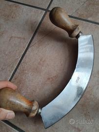 4 vecchi arnesi/ utensili da cucina, mezzaluna vintage, tutti con un marchio ( PM Inoxid , Coltellerie di Erba, Mondin Inoxid e "S" ) , in buone condizioni. Solo ad uno ( il più grande) manca uno dei 2 anelli tra manico e lama ( vedi foto con freccia rossa ) .La parte cerchiata in rosso nell'altra foto indica dello "scotch" messo a protezione della lama ; apparentemente potrebbe sembrare rovinata la lama, invece non c'è nessun problema.