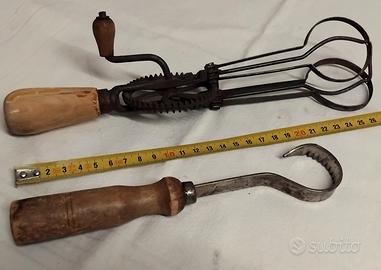 Lotto di 4 vecchi arnesi - utensili da cucina, molto carini, vissuti ma in buone condizioni generali ; il frullino è completo e funzionante ( e non facile da trovare).