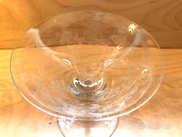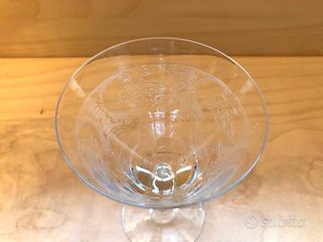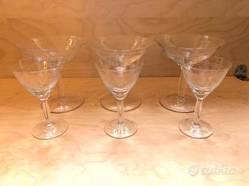 Bicchieri da cocktail come da foto. 2 dei 3 bicchieri grandi presentano sbeccature piccole ma visibili lungo il bordo della bocca. Sottilissimi al tatto.