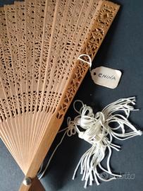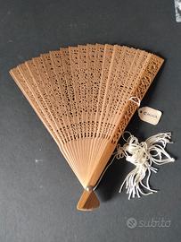 Ventaglio molto vecchio anche profumato di materiale difficile da definire tipo di legno Che si trova in Cina leggerissimo e sottilissimo con scatola a vista e bigliettino di riconoscimento con bollino rosso obbligatorio per uscire dal territorio cinese che comprova l'acquisto autorizzato nei negozi in Cina