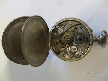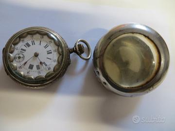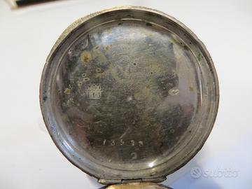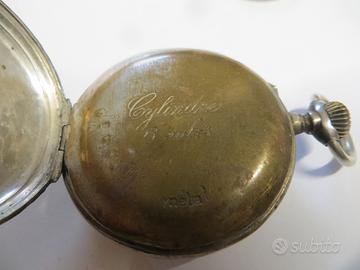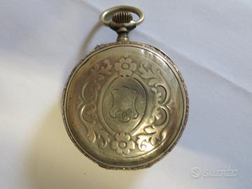 Cassa in argento . Orologio da tasca risalente a fine ottocento. Quadrante in porcellana bianca lancette e numeri neri. Fondello esterno in argento titolo 800 con fregio e stemma quello interno con scritto - Cylindre 6 rubis. Il pulsante accanto alla corona deve essere premuto per impostare l'ora.