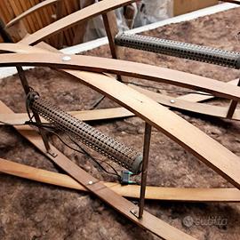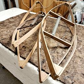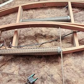 2 scaldini da letto degli anni '30, detti "prete". Sono a forma di doppia losanga e apribili per formare un elemento autoportante che veniva infilato sotto le coperte per generare calore. Dotati di resistenze collegati ai cavi e relative prese.