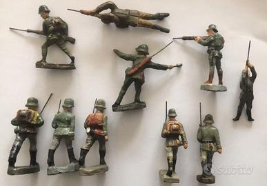 10 vecchi soldatini in pasta senza marchio. Produzione tedesca anni 30/ 40. Particolarmente interessante è il soldatino con bomba a mano. L'elmetto è danese e la produzione molto probabilmente è Elastolin. Il simbolo sembra abraso . Chi sa perchè ? Forse perchè era un nemico. Un'altro soldatino ,quello all'attacco, non sembra avere l'elmetto tedesco.