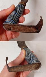 vecchia / antica roncola / ronca / falcetto, forgiata a mano e marchiata ( non riesco però a identificare le lettere tra i 2 simboli) .La copertura dell'impugnatura è molto particolare, davvero un bel pezzo .
