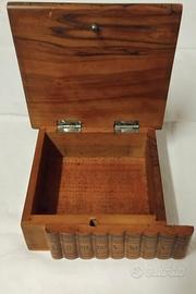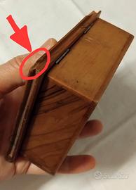 Bellissima vecchia/antica scatola "porta oggetti" in legno, finemente lavorata, con particolare sistema di apertura/chiusura ; facendo scorrere verso destra la fascia di "LIBRI", si sblocca la chiusura ed è possibile alzare il coperchio. Purtroppo ha 2 punti danneggiati (vedi foto con frecce rosse) . Uno davvero poco evidente, l'altro è sicuramente più visibile ; fortunatamente sono entrambi dietro. 20 euro + spese di spedizione.