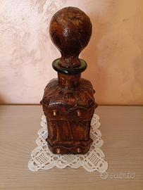 Vecchia bottiglia in vetro rivestita in cuoio.