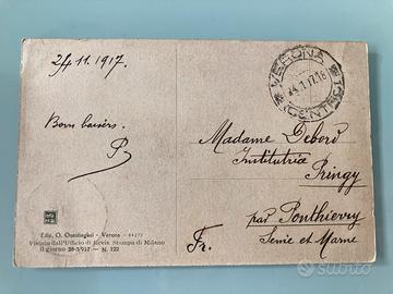 La prima immagine è una cartolina in bianco e nero che raffigura l’Arena di Verona, uno dei simboli più celebri della città. Si può notare una fontana al centro di un giardino nella parte anteriore dell’immagine, con l’anfiteatro romano sullo sfondo. L’Arena è ben riconoscibile grazie alle sue arcate e alla struttura imponente. In basso a destra è presente un francobollo italiano da 10 centesimi, con l’effigie del re Vittorio Emanuele III. Il timbro postale mostra la data “24.11.17”, ossia il 24 novembre 1917, durante la Prima Guerra Mondiale. La seconda immagine mostra il retro della cartolina. È scritta a mano e indirizzata a “Madame Debori”, un’insegnante residente a Pringy, in Francia, nella regione della Senna e Marna (Seine-et-Marne). Il testo è molto breve e firmato con “Bon baisers” (baci) seguito da una sigla “P”. La data scritta a mano è 24.11.1917” Questa cartolina ha un notevole valore storico, sia per la sua connessione alla Prima Guerra Mondiale, sia per la raffigurazione dell’Arena di Verona. Il francobollo da 10 centesimi con l’effigie di Vittorio Emanuele III è un elemento interessante per i collezionisti filatelici. La data e il contesto (1917) aggiungono ulteriore interesse storico.