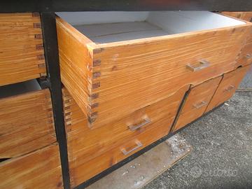 VECCHIA CASSETTIERA DA NEGOZIO Vecchia cassettiera degli anni ’50 con 16 cassetti di diverse misure, ha una lunghezza di cm 255, profonda cm 65 ed alta cm 98. Posso valutare la possibilità di consegnare con mio mezzo al puro rimborso spese.