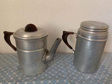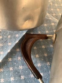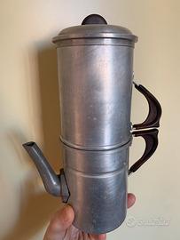 vecchia caffettiera / moka napoletana ( cuccumella) in allumiinio con manici e pomello ( del coperchio) in bachelite marrone ( o materiale simile), molto carina .Altezza cm.25 circa, in buone condizioni ; da segnalare un colpo preso sul fonso della caffettiera ( vedi ultima foto). Su uno dei 2 fondi é riportato il marchio dell'azienda mentre sull'altro (a seconda di come é girata) é riportato il numero delle tazze , 6 , che però leggendolo al contrario diventa 9. Viste le dimensioni direi 9, ma non sono certo.