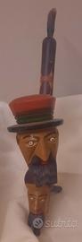 Vecchia pipa artigianale o artistica da collezione o come soprammobile, intagliata nel legno con due teste. Presenta due volti uno più grande con cappello e barba e uno più piccolo sottostante con barba. Il fornello dove inserire il tabacco è situato nella testa della figura superiore.