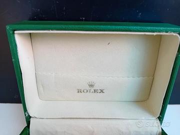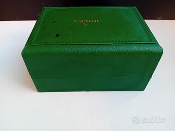 Vecchia scatola astuccio Rolex in pelle verde. Dimensioni cm. 18x13x9, manca il rivestimento del fondo e sul coperchio ci sono macchie d'inchiostro visibili nelle foto allegate.