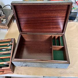 Vecchia scatola da gioco porta carte e fish rifinita in pelle, così come si vede in fotografia, le misure sono sempre nelle foto.