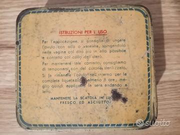SCATOLA METALLO FARMACIA VINTAGE Vecchia e rara scatola "OVULI VAGINALI " di glicerina solidificata, Industria Farmaceutica "FARMACO MERANO", in buone condizioni. La scritta "17x100" che vedete sul coperchio è incisa sulla scatola. 20 euro + spese di spedizione xxxxxxxxxxxxxx Cerca su Subito "vecchi bicchieri posacenere pubblicitari ", troverai altre vecchie scatole pubblicitarie .