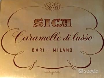 vecchia scatola di latta anni 50/60 "Sica" caramelle di lusso, qualche piccolo segno del tempo ma in buone condizioni.Dimensioni :cm.14 x 13 x h. 5,2.