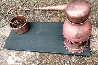 Alambicco dimostrativo da vecchia aula didattica di un istituto agrario, esso è funzionante, completo di fornelletto ad alcool. Montato su base in legno che misura cm 70 x 30, l’altezza dell’oggetto è di circa cm 37. In omaggio tre bottigliette di grappa della Nonino risalenti agli anni 60-70.